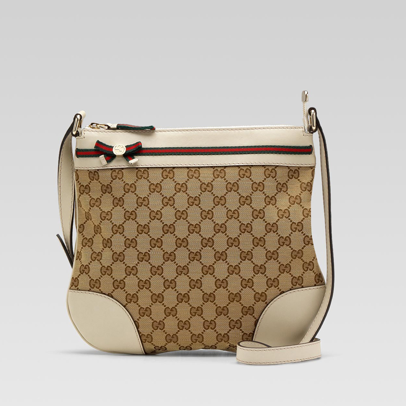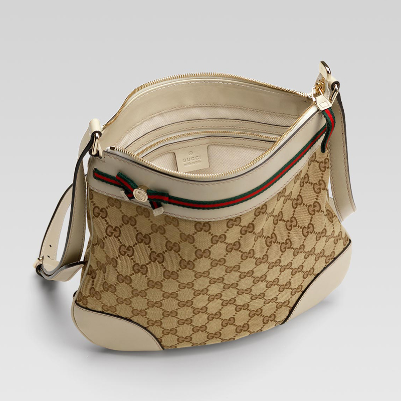 - beige/ebony GG fabric with off-white leather trim and green/red/green signature web