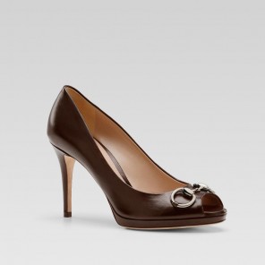 'new hollywood' mid heel open-toe platform pump with horsebit detail.