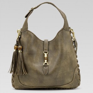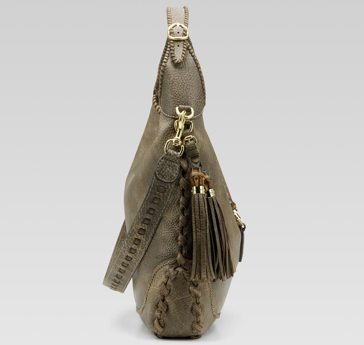 'new jackie' large shoulder bag with hand stitching, tassels, and bamboo detail.