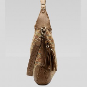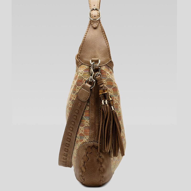 'new jackie' large shoulder bag with hand stitching, tassels, and bamboo detail.