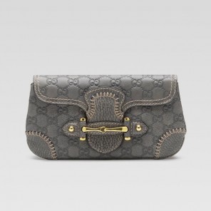 'new pelham' evening bag with horsebit detail, embossed gucci script logo, and studs.