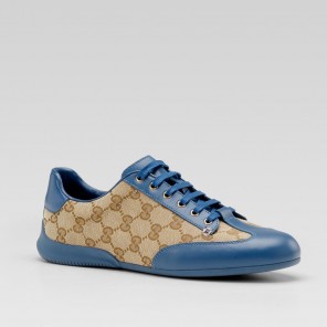 - website exclusive - beige/ebony GG fabric with blue leather trim - rubber sole