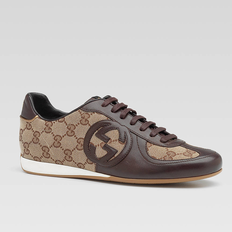 - beige/ebony GG fabric with brown leather and metallic gold leather trim- rubber sole