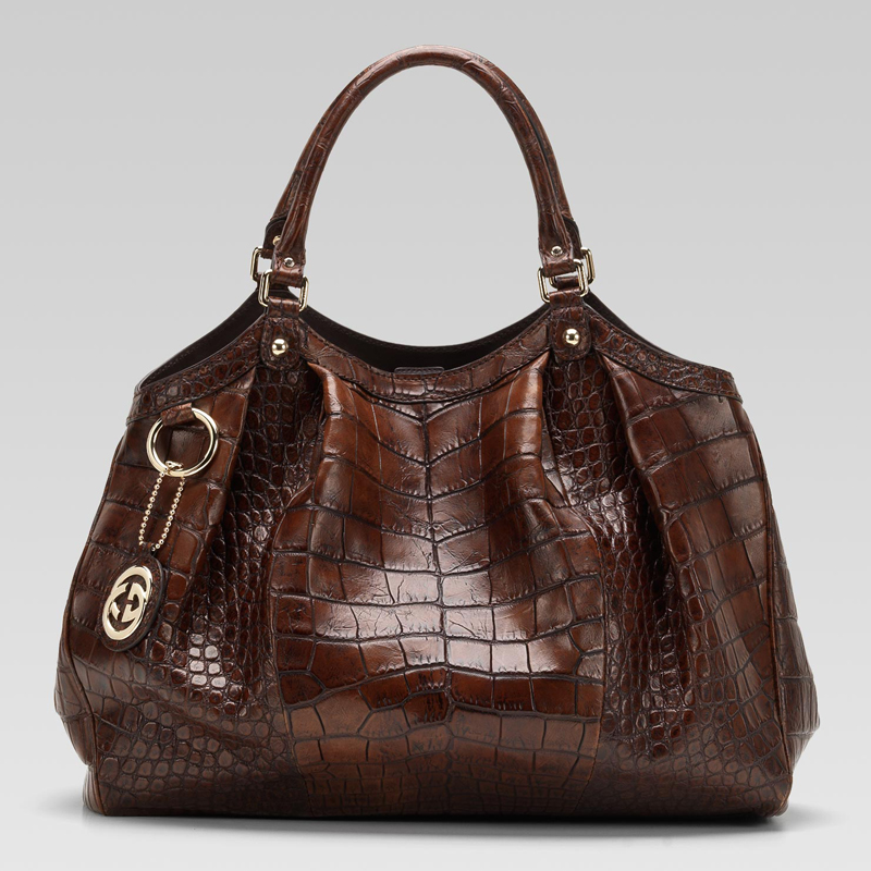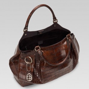 - chocolate crocodile - light gold hardware - double handles with 7" drop - tab snap closure and side snaps