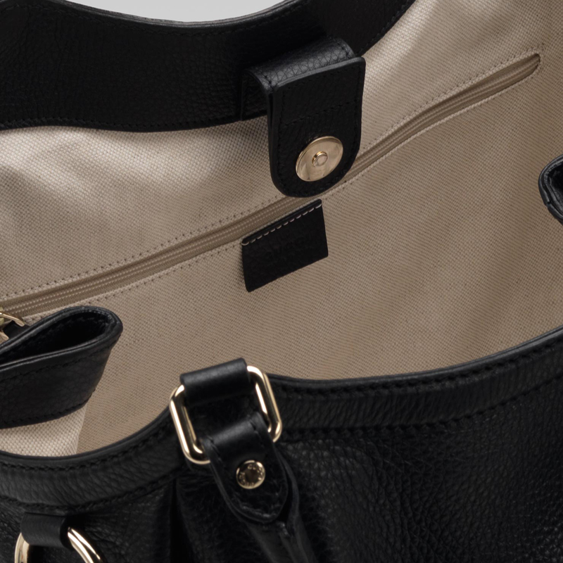 - black leather - light gold hardware - double handles with 7" drop - tab snap closure and side snaps