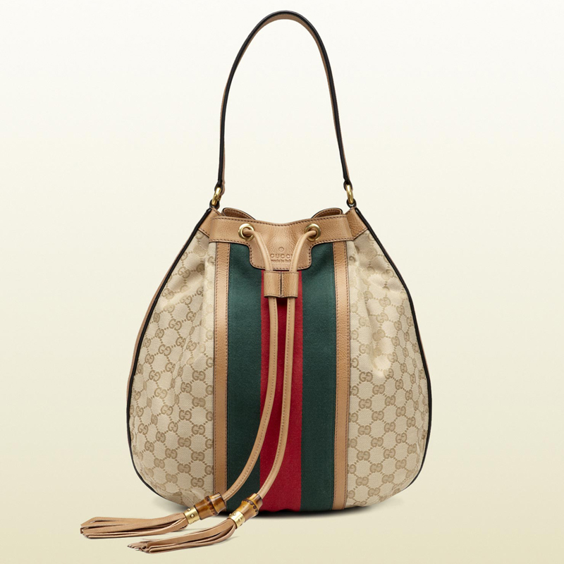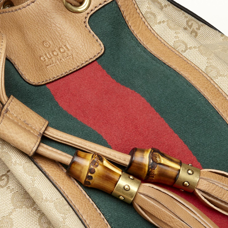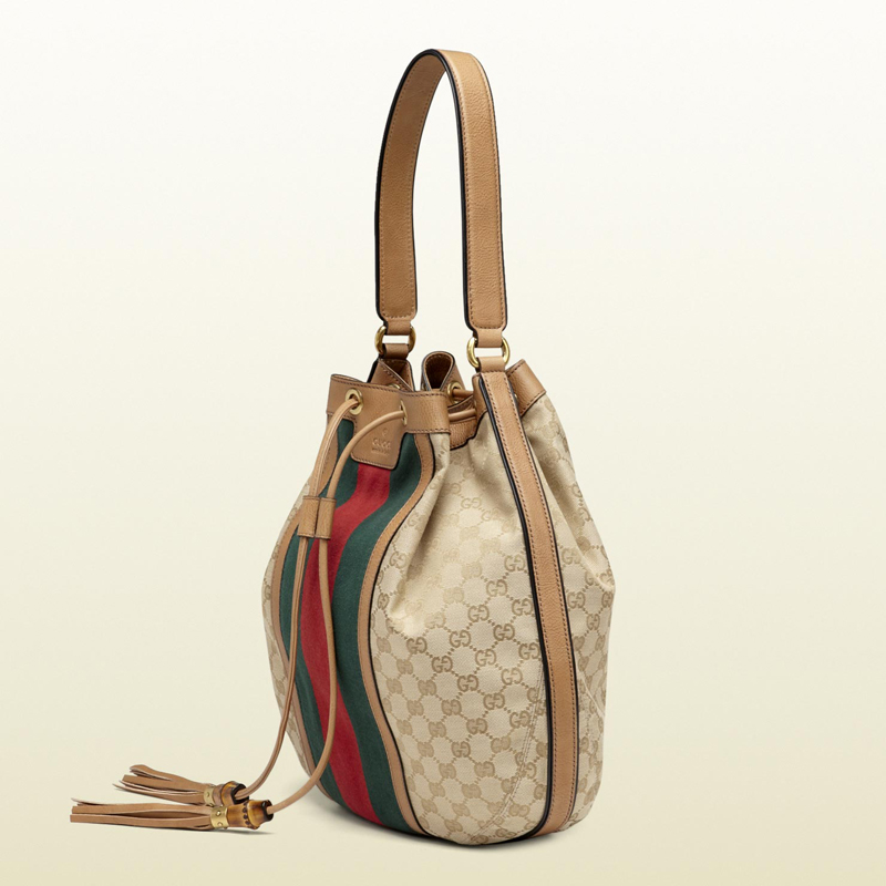 Paying homage to Gucci's equestrian roots, the signature web makes a bold statement on an everyday drawstring shoulder bag.