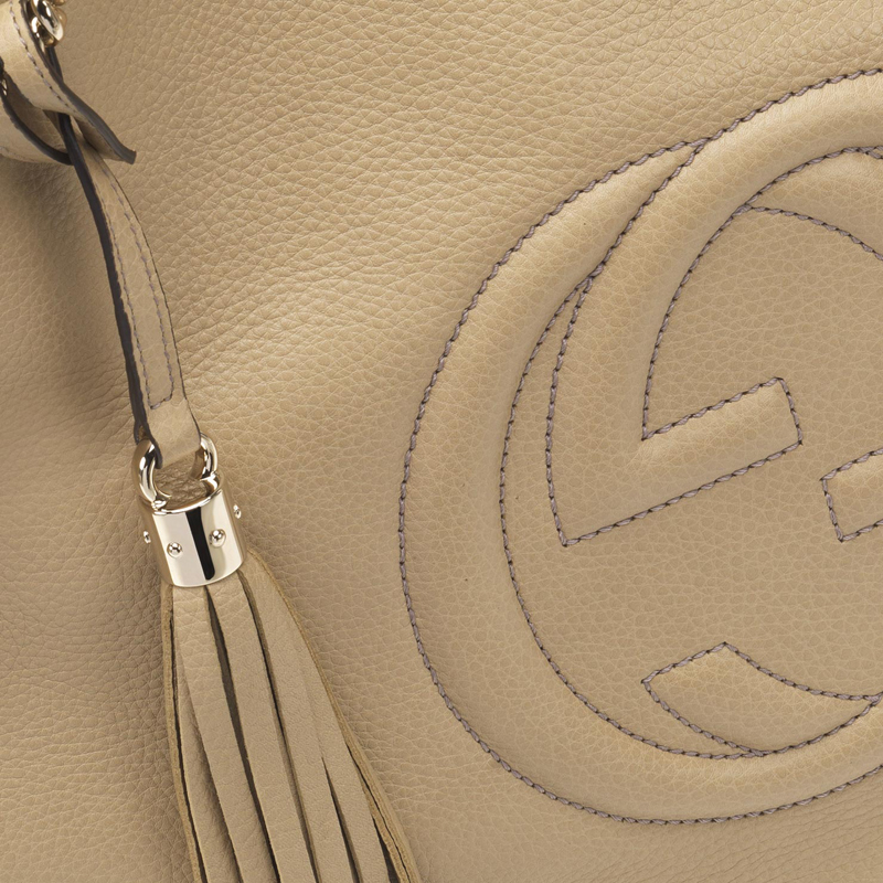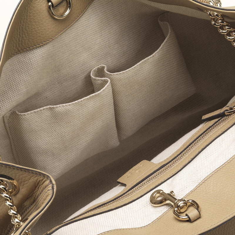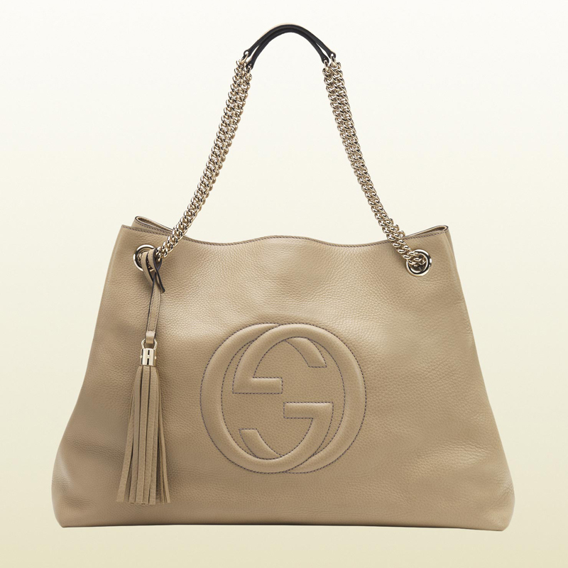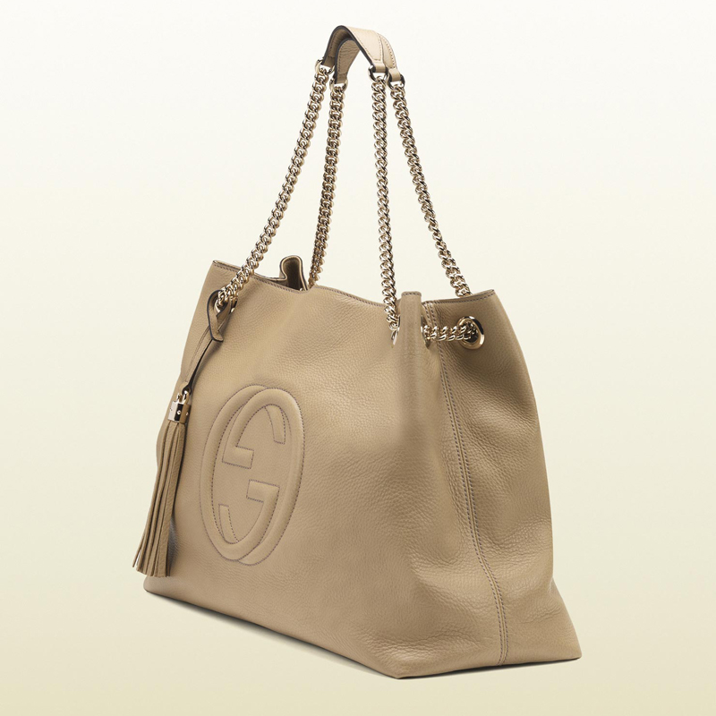 Function meets elegance in a modern leather tote with striking chain straps. The soft neutral color makes it a beautiful investment piece.