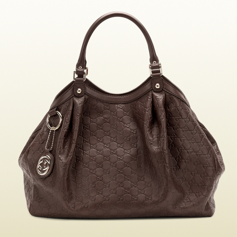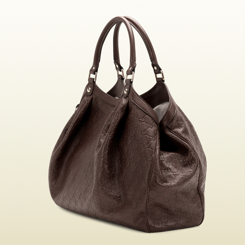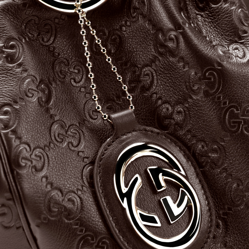 - chocolate guccissima leather- light gold hardware- double handles with 7" drop- tab snap closure and side snaps- detachable interlocking G leather tag
