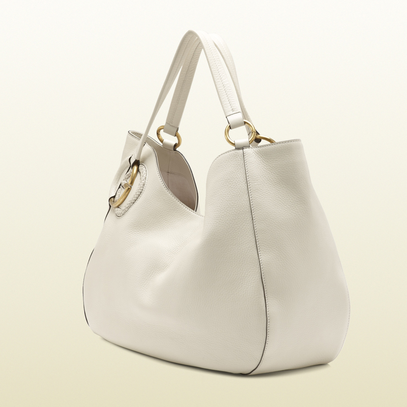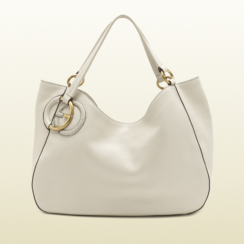 In our classic white leather, this new shoulder bag exhibits a practical shape with a woven interlocking G, expertly crafted by hand in Italy.