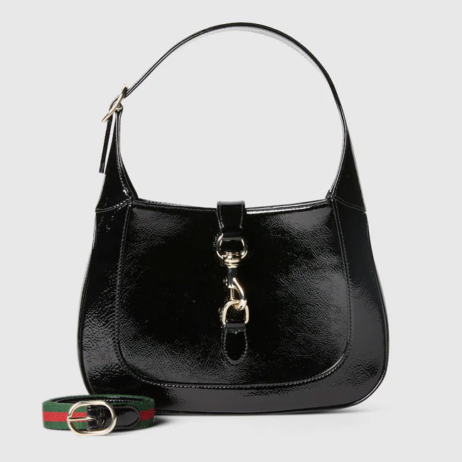 The new Gucci Jackie is crafted from fine leather which highlights the craftsmanship, crescent shape, and sleek silhouette of the House's iconic shoulder bag. Light gold-toned hook closure, leather trim, and an additional strap featuring the green and red Web gives this Gucci Jackie small shoulder bag in black patent leather further styling options.