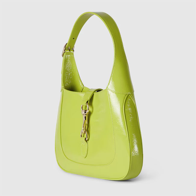 In the Spring Summer 2025 collection, this Gucci Jackie 1961 small shoulder bag is crafted from bright green patent leather, complete with light gold-toned hook closure and an additional strap.