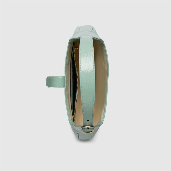Inspired by the summer spirit and beach clubs on the Italian coast, this item is part of Gucci Lido. This Gucci Jackie is crafted from patent leather which highlights the craftsmanship, crescent shape, and sleek silhouette of the House's iconic shoulder bag. Light gold-toned hook closure and an additional strap featuring the green and red Web gives this small shoulder bag in pastel green further styling options.