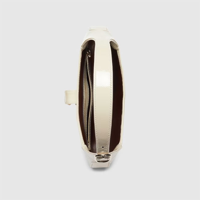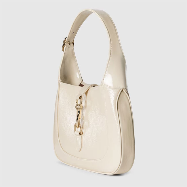 The new Gucci Jackie is crafted from fine leather which highlights the craftsmanship, crescent shape, and sleek silhouette of the House's iconic shoulder bag. Light gold-toned hook closure, leather trim, and an additional strap featuring the green and red Web gives this Gucci Jackie small shoulder bag in ivory leather further styling options.
