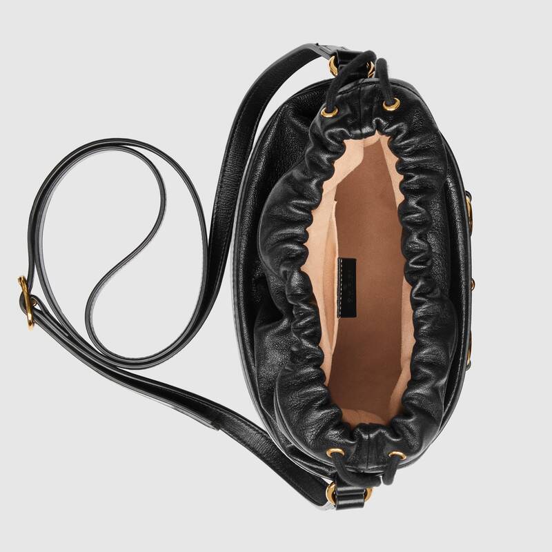 Inspired by archival designs, Gucci 1955 Horsebit bucket bag unifies the original details first introduced over six decades ago with a modern spirit, highlighting the Horsebit. Part of Gucci鈥檚 genetic code, the double ring and bar design has been established as one of the most distinctive elements among the House symbols borrowed from the equestrian world. The hardware is paired with a contemporary mix of materials, combining textured and soft black leather to create a unique tonal effect.