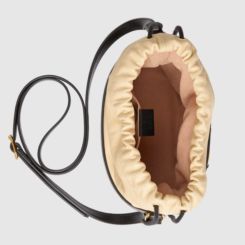 Inspired by archival designs, Gucci 1955 Horsebit bucket bag unifies the original details first introduced over six decades ago with a modern spirit, highlighting the Horsebit. Part of Gucci鈥檚 genetic code, the double ring and bar design has been established as one of the most distinctive elements among the House symbols borrowed from the equestrian world. The hardware is paired with a contemporary mix of materials, combining textured and soft black leather to create a unique tonal effect.