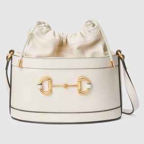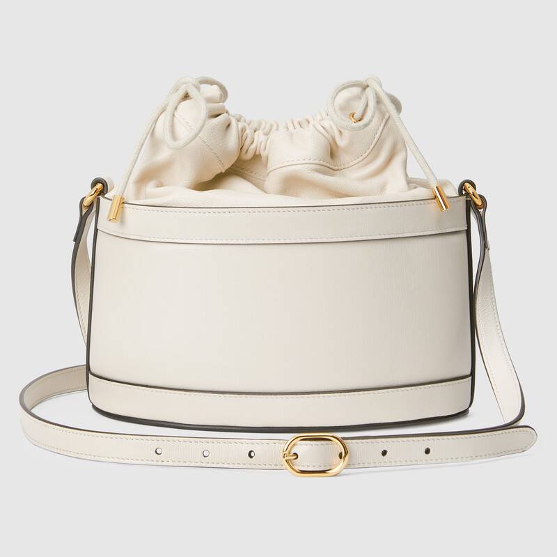 Inspired by archival designs, Gucci 1955 Horsebit bucket bag unifies the original details first introduced over six decades ago with a modern spirit, highlighting the Horsebit. Part of Gucci鈥檚 genetic code, the double ring and bar design has been established as one of the most distinctive elements among the House symbols borrowed from the equestrian world. The hardware is paired with a contemporary mix of materials, combining textured and soft white leather to create a unique tonal effect.