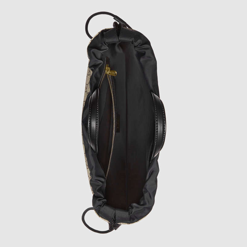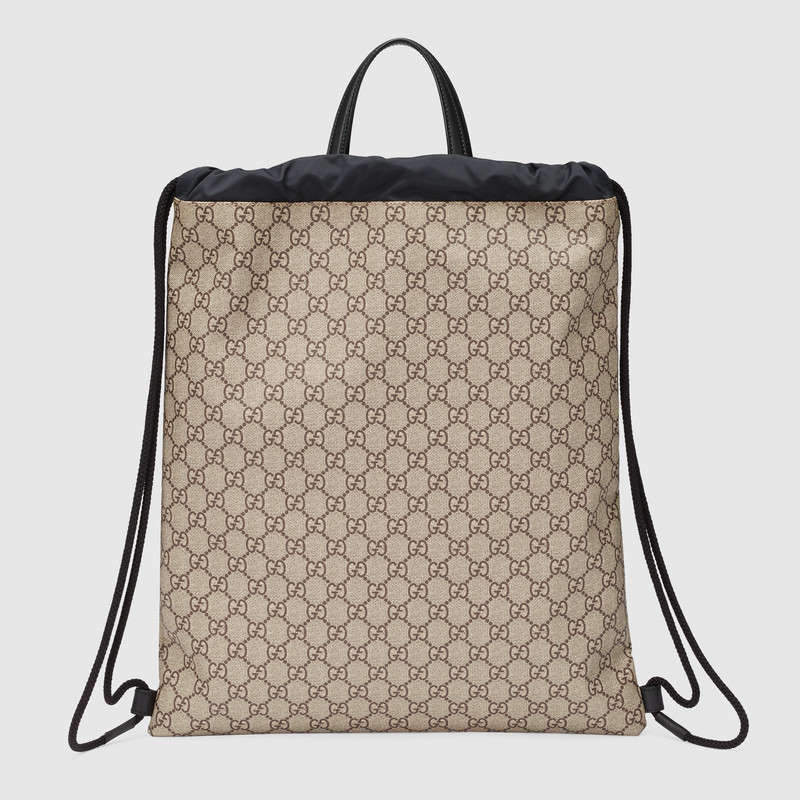 The drawstring backpack is an important silhouette for Pre-Fall, with a soft construction and resistant nylon lining. Made in soft GG Supreme with Angry Cat print-a motif found throughout the men's and women's collections, specially printed to create a three-dimensional effect. At the bottom of the bag is the embroidered word "Loved"-an evolution of the phrase "Blind for Love" introduced by Alessandro Michele.