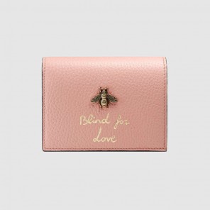 Part of the Animalier collection, the leather card case features the distinctive metal bee detail and the phrase "Blind For Love"-an evolution of the French "L'Aveugle Par Amour" introduced by Alessandro Michele, in embossed gold foil.