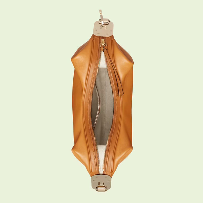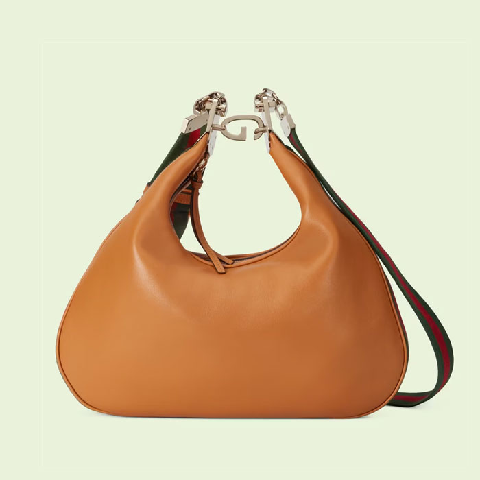 An ode to the timeless Hollywood glamour that shaped Gucci Love Parade, classic elements from the House's archives are reintroduced. Distinguished by its crescent moon shape, the accessory is further defined by a G shaped hook closure. Paired with soft materials, the heritage hardware creates a refined design with vintage appeal. This large version is crafted in dark orange leather with green and red Web trim.