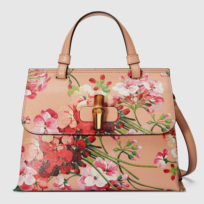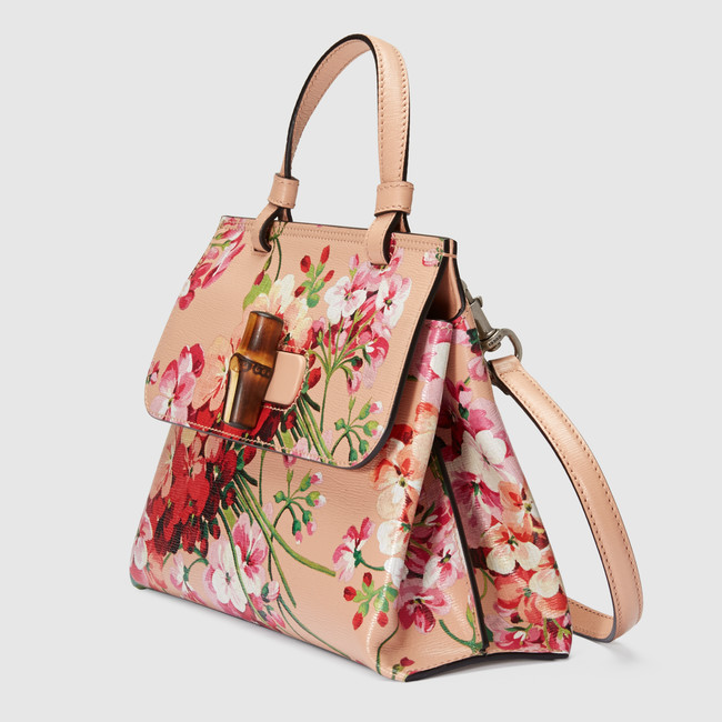 The small Bamboo Daily top handle bag has a black enamel bamboo closure and a detachable shoulder strap. Made in a natural grain leather with our blooms print.