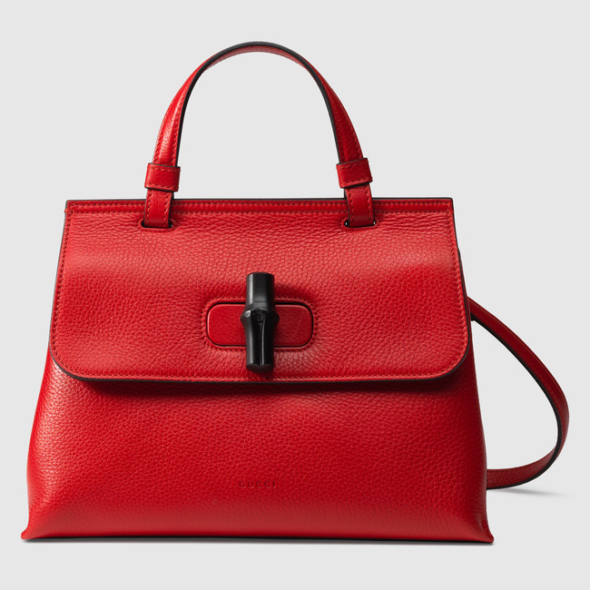 The small Bamboo Daily top handle bag has a black enamel bamboo closure and a detachable shoulder strap. Made in our light, natural grain leather.