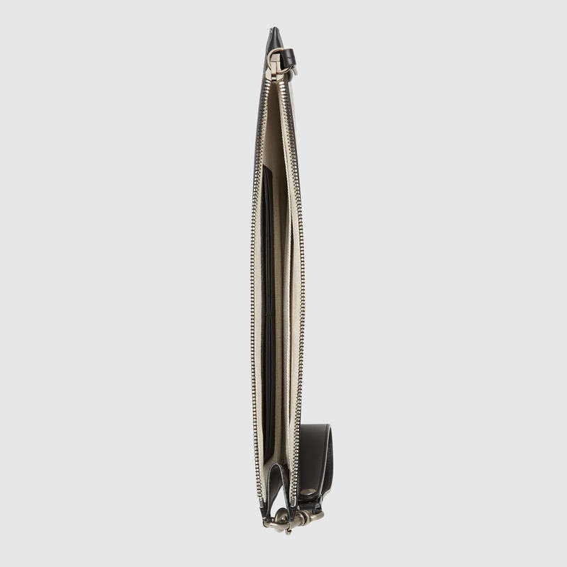 Each season the GG motif is enriched with new prints and motifs. The bee-a symbol that has become synonymous with the House-is printed at the center of a slim pouch made in GG Supreme canvas, a material with low environmental impact. The phrase "Blind for Love" frames the image.