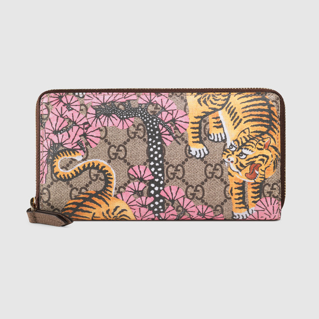 A zip around wallet made in GG Supreme canvas with Gucci Bengal print, introduced for Cruise 2017. The print depicts tigers scattered amongst a colorful forest represented through brushstroke-style graphics to create a three-dimensional effect against the GG motif.