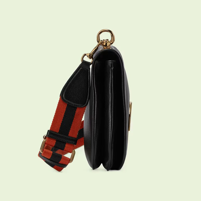 Coming from the House's archives, a geometrically shaped version of the Interlocking G logo is reintroduced for Gucci Love Parade. The gold-toned hardware adds a defined vintage feel to the style, enriching the design with a timeless feel鈥攎irroring the Hollywood glamour that shaped the fashion show. The black leather bag is completed by two interchangeable shoulder straps, in tonal leather or the Web stripe.