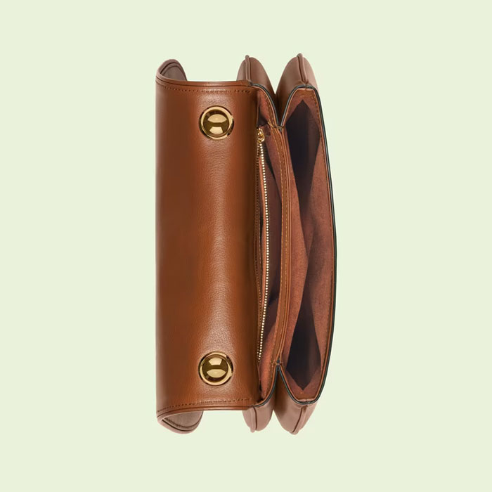 Coming from the House's archives, a geometrically shaped version of the Interlocking G logo is reintroduced for Gucci Love Parade. The emblem enriches the design with a timeless feel鈥攎irroring the Hollywood glamour that shaped the fashion show. This medium-sized version of the accessory is presented in brown leather.
