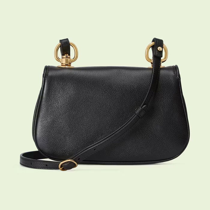 Coming from the House's archives, a geometrically shaped version of the Interlocking G logo is reintroduced for Gucci Love Parade. The gold-toned hardware adds a defined vintage feel to the style, enriching the design with a timeless feel鈥攎irroring the Hollywood glamour that shaped the fashion show. The black leather min bag is completed by two interchangeable shoulder straps, in tonal leather or the Web stripe.