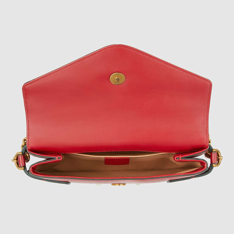A mini bag with pearl studs and metal bee detail. The bee's striped body is highlighted with blue enamel and red crystal stones and the wings are embellished with pearl effect studs. The bee-a symbol first seen in Gucci ready-to-wear in the 1970s-was taken from the archives and reintroduced in the Fall Winter 2015 collection.
