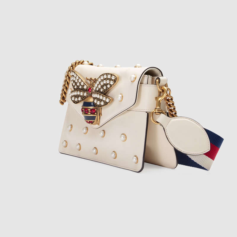 A mini bag with pearl studs and metal bee detail. The bee's striped body is highlighted with blue enamel and red crystal stones and the wings are embellished with pearl effect studs. The bee-a symbol first seen in Gucci ready-to-wear in the 1970s-was taken from the archives and reintroduced in the Fall Winter 2015 collection.