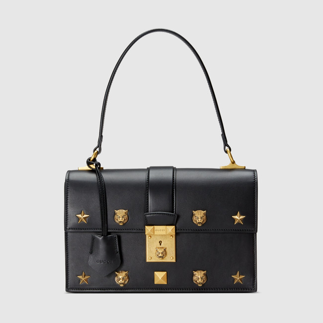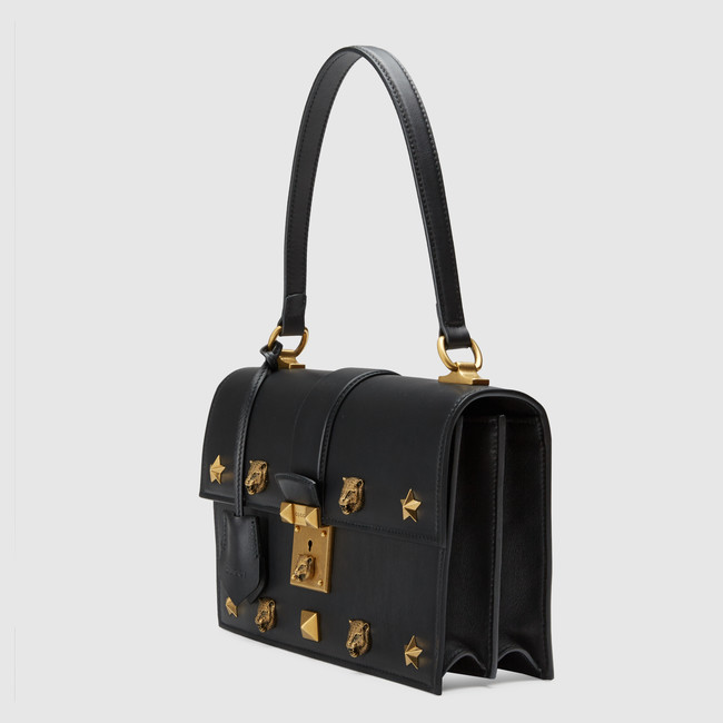 The Cat Lock top handle bag has star and feline head studs. The feline has been a recurring theme throughout Alessandro's new collection, here it adds a bit of contrast to our classic lock closure.