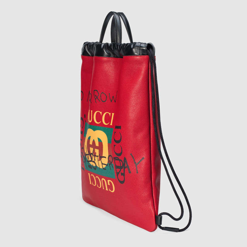For Fall Winter 2017, artist Coco Capit谩n collaborated with Gucci on a special range of accessories and ready-to-wear that feature her signature phrases. The ironic and witty handwritten aphorisms appear over the Gucci vintage logo and bring together Coco Capit谩n鈥檚 offbeat sense of humor with the eclectic House aesthetic. This leather drawstring backpack is printed with the phrase "What are we going to do with all this future?" The two leather handles allow this style to also be worn as a tote.