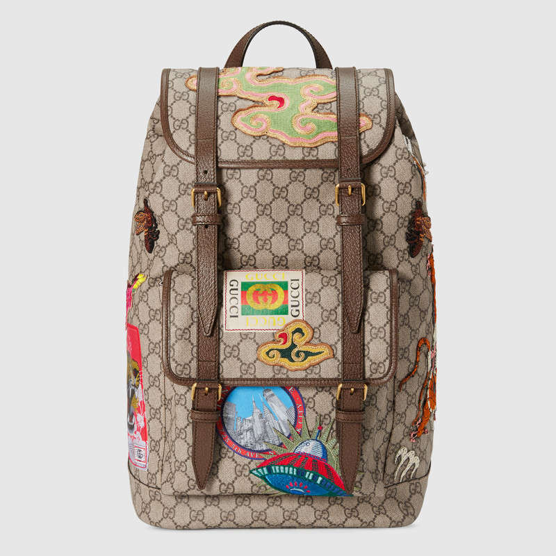 Travel continues to be a source of inspiration for Alessandro Michele. A collection of bags in the GG motif is enriched with a blend of contemporary embroideries-like the UFO-and vintage inspired details, including airmail trims and a Gucci vintage logo from the archives. The appliques are individually embroidered and then skillfully hand-applied to each piece by specialized artisans. This process ensures that no two items will be alike, giving each a one-of-a-kind appearance.