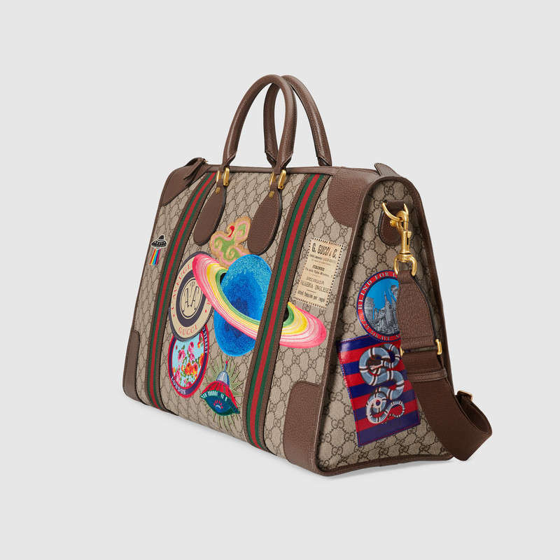 Travel continues to be a source of inspiration for Alessandro Michele. A collection of bags in the GG motif is enriched with a blend of contemporary embroideries-like the UFO-and vintage inspired details, including airmail trims and a Gucci vintage logo from the archives. The appliques are individually embroidered and then skillfully hand-applied to each piece by specialized artisans. This process ensures that no two items will be alike, giving each a one-of-a-kind appearance.