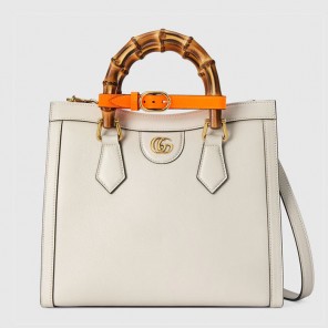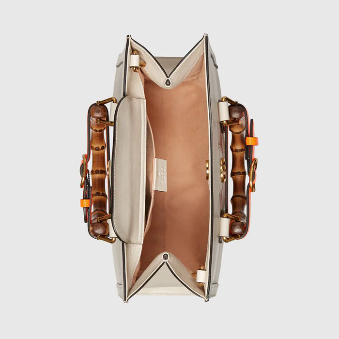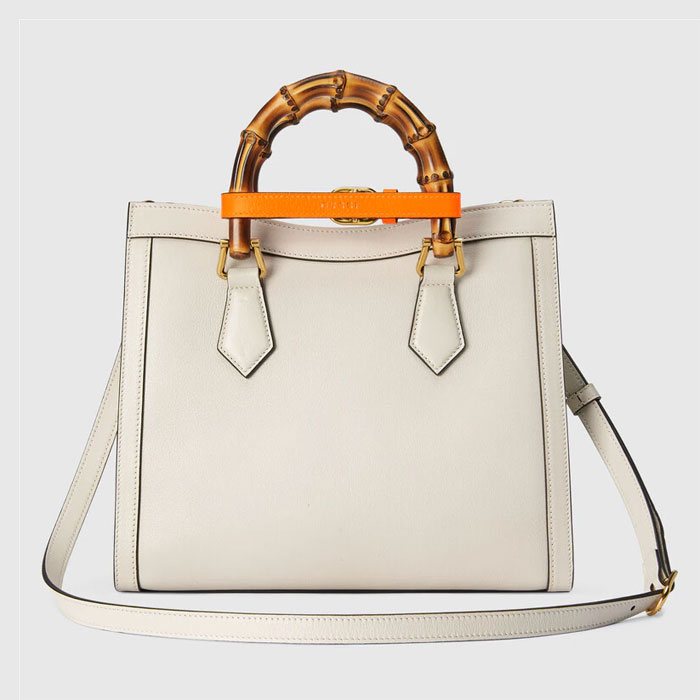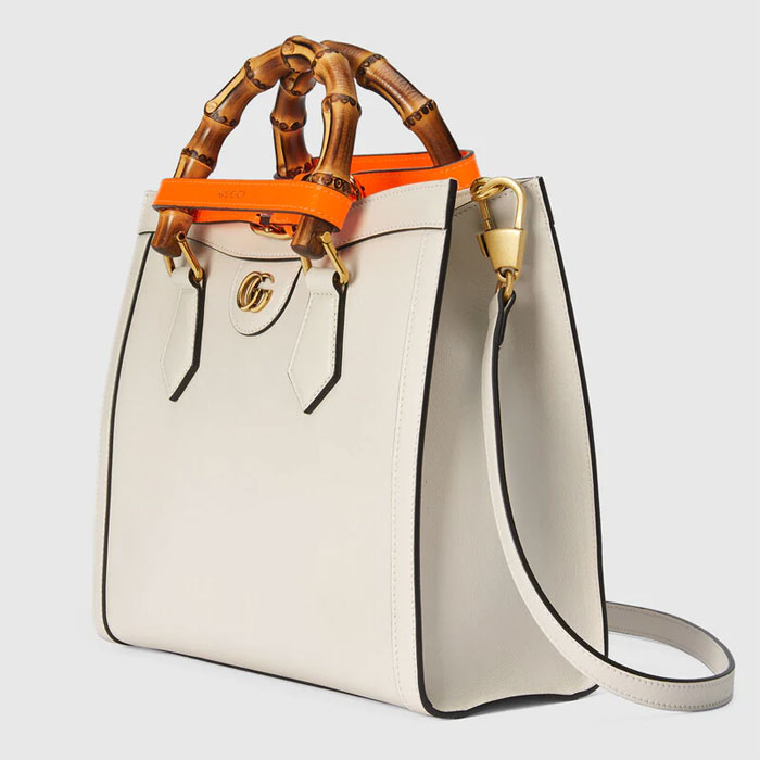 Combining recognizable elements of the House, the small tote bag is defined by its bamboo handles and Double G hardware. Crafted from black leather, the accessory is further accentuated by two neon bands, a playful reference to the bands used to keep handles in shape.