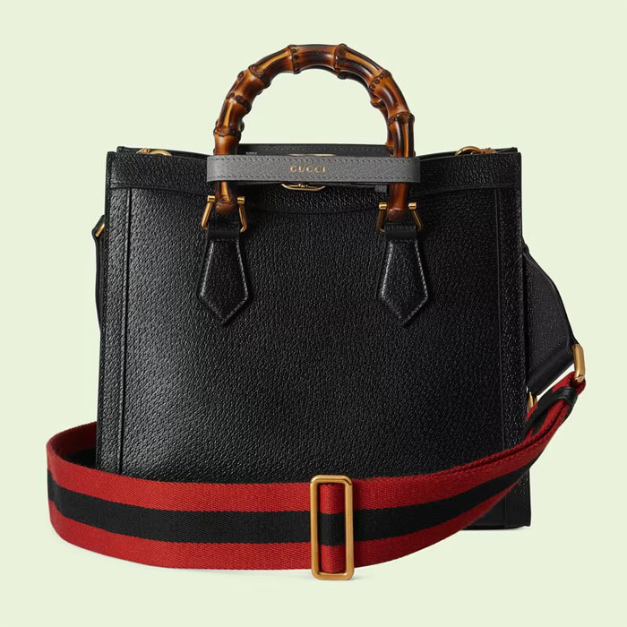 Combining recognizable elements of the House, the small tote bag is defined by its bamboo handles and Double G hardware. Crafted from black leather, the accessory is further accentuated by two colored belt details, a playful reference to the bands used to keep handles in shape.