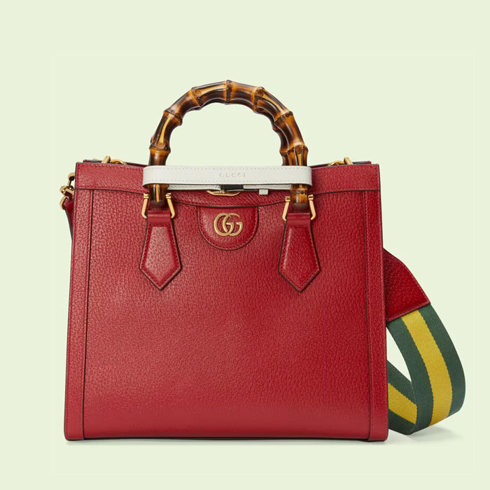 Instantly recognizable emblems of the brand, logos enrich designs in new and unexpected ways. Behind every logo lies the tradition and value of the House, an everlasting medium one can wear again and again. Following the idea of constant change and experimentation, different iterations of Gucci symbols appear each season. The Gucci Diana combines instantly recognizable bamboo hardware with the Double G monogram. The small tote bag is presented in red leather.