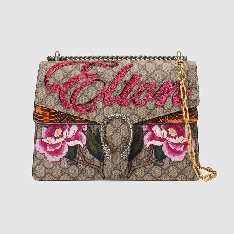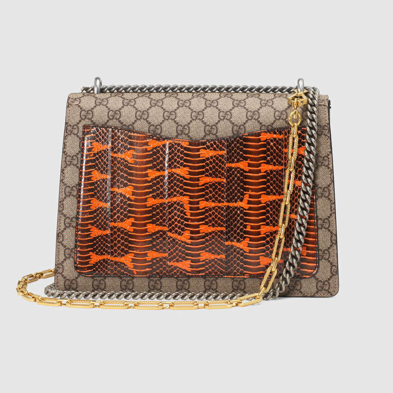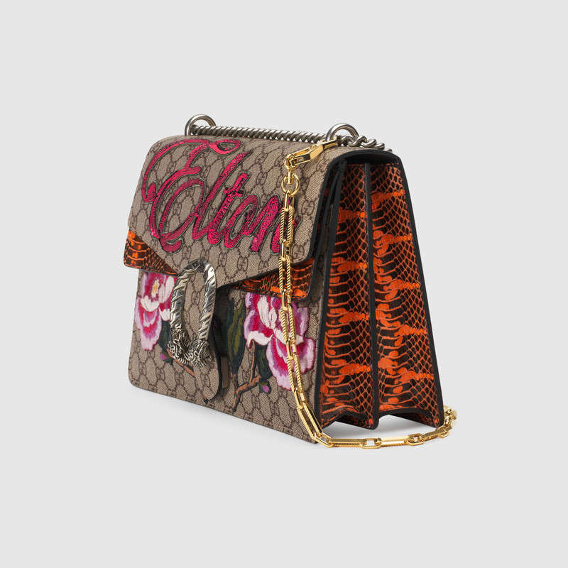 The Dionysus shoulder bag with the now defining textured tiger head closure. A tribute sequin "Elton" embroidery contrasted by floral appliques. The layers of appliques over the GG pattern is an essential part of Alessandro Michele's designs. The sliding chain strap can be worn multiple ways, changing between a shoulder and a top handle bag. The orange snakeskin adds a second dimension in a bright contrast color.