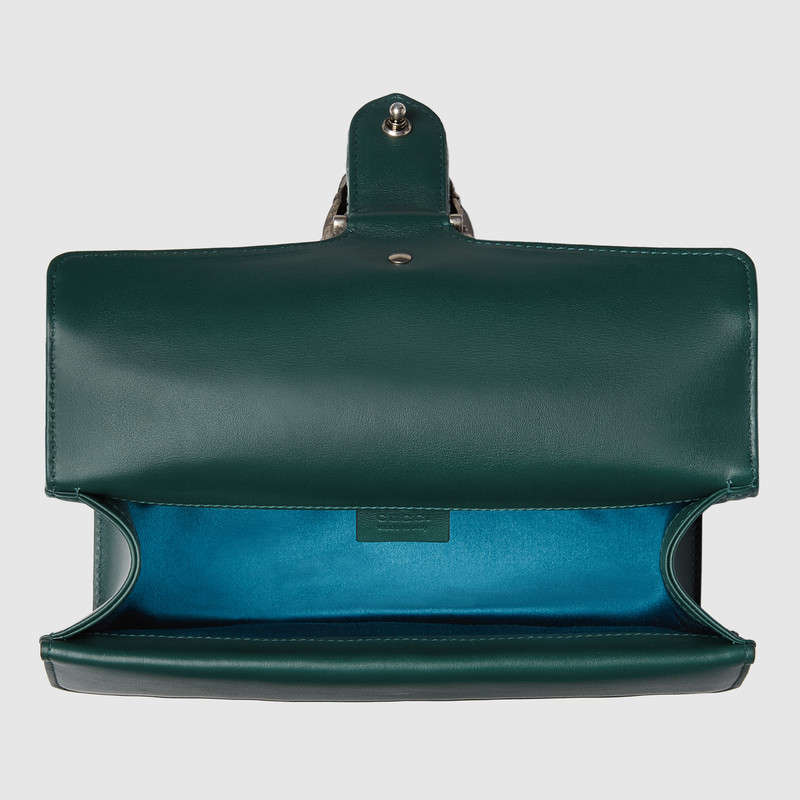 Introduced in GG velvet鈥攁n archival material with the GG motif embedded into soft velvet鈥攖he Dionysus shoulder bag continues to be a defining silhouette. Enriched with crystals, the tiger head closure is a unique detail referencing the Greek god Dionysus, who in myth is said to have crossed the river Tigris on a tiger sent to him by Zeus. The sliding chain strap can be worn multiple ways, changing between a shoulder and a top handle bag.