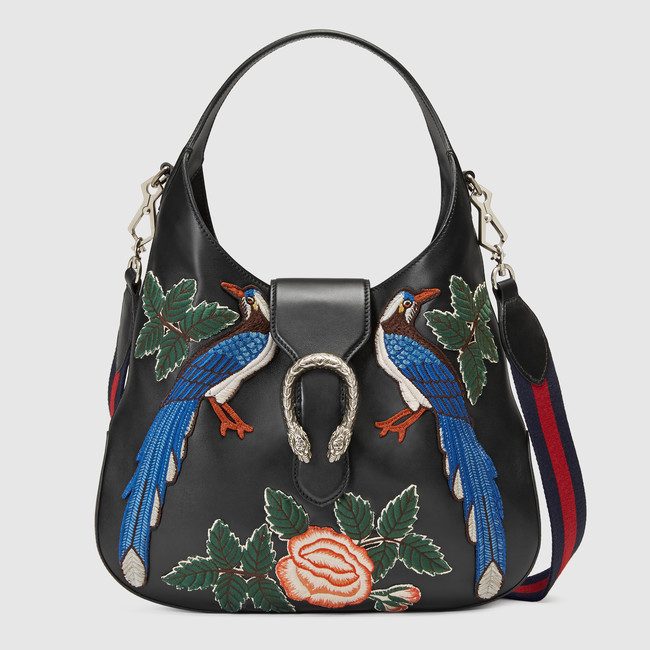 The Dionysus hobo is a new shape this season complete with the tiger heard closure-a unique detail referencing the Greek god Dionysus, who in myth is said to have crossed the river Tigris on a tiger sent to him by Zeus. Embroidered bird appliques decorate the front of the bag complemented by floral appliques.
