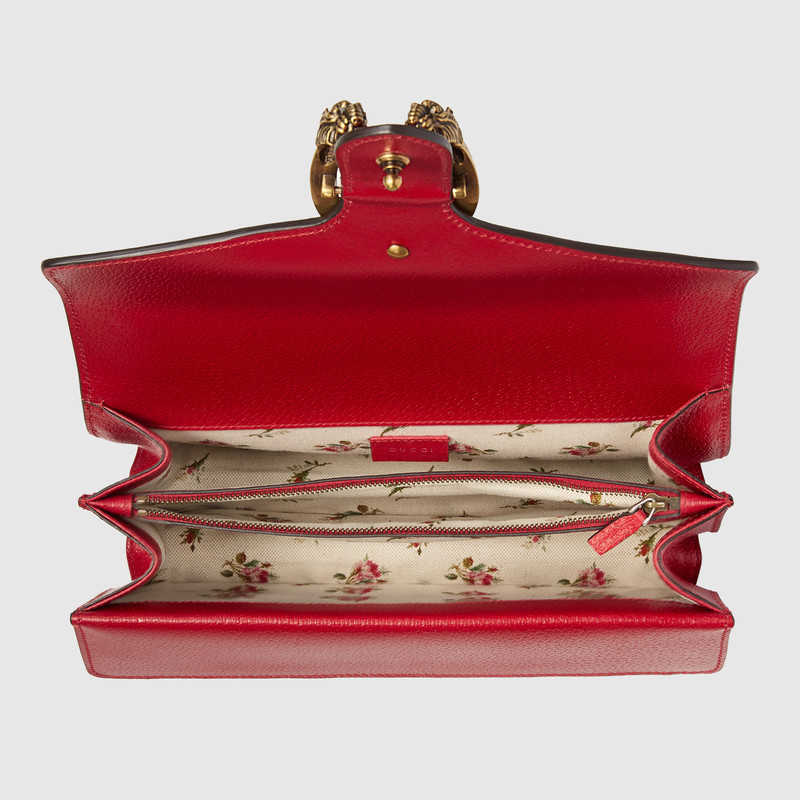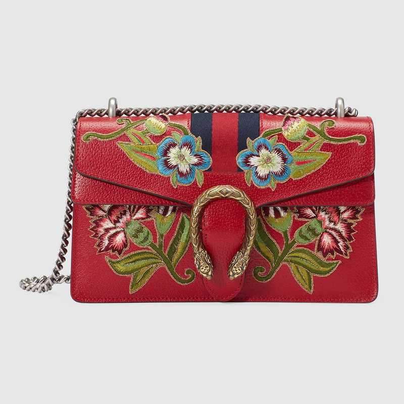 The Dionysus shoulder bag with the now defining tiger head closure-a unique detail referencing the Greek god Dionysus, who in myth is said to have crossed the river Tigris on a tiger sent to him by Zeus. Embroidered floral appliqu茅s add a romantic touch to the handbag. The sliding chain strap can be worn multiple ways, changing between a shoulder and a top handle bag. Made in an imprinted leather giving it a textured appearance which replicates an archival Gucci material.