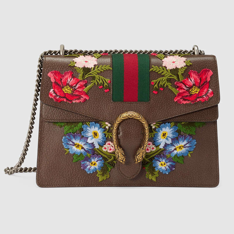 The Dionysus shoulder bag with the now defining tiger head closure-a unique detail referencing the Greek god Dionysus, who in myth is said to have crossed the river Tigris on a tiger sent to him by Zeus. Embroidered floral appliques add a romantic touch to the handbag. The sliding chain strap can be worn multiple ways, changing between a shoulder and a top handle bag. Made in an imprinted leather giving it a textured appearance which replicates an archival Gucci material.
