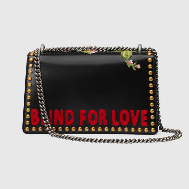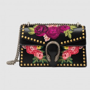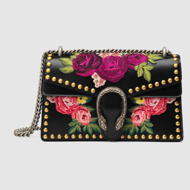 The Dionysus shoulder bag with the now defining textured tiger head closure-a unique detail referencing the Greek god Dionysus, who in myth is said to have crossed the river Tigris on a tiger sent to him by Zeus. Embroidered floral appliques balance gold toned studs outlining the edges. The sliding chain strap can be worn multiple ways, changing between a shoulder and a top handle bag. Made in a smooth, glossy leather with a firm surface for a structured shape.