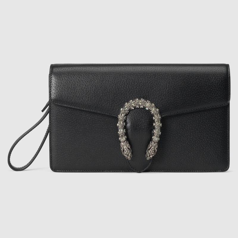 The Dionysus clutch is introduced for Spring 2020 in a folded flap design. Crafted from textured black leather, the envelope-style shape is finished with a detachable wrist strap and the line's defining tiger head closure鈥攁 reference to the Greek god Dionysus鈥攅ncrusted with sparkling crystals.