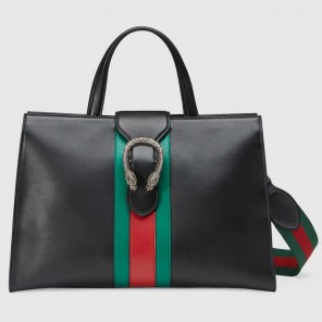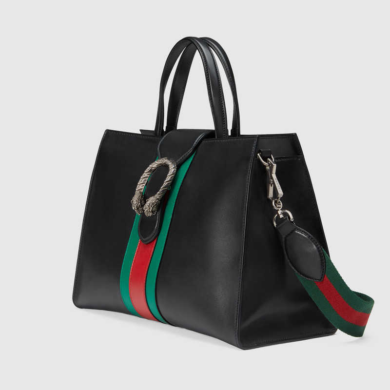 A new top handle bag in the Dionysus collection with the tiger head closure-a unique detail referencing the Greek god Dionysus, who in myth is said to have crossed the river Tigris on a tiger sent to him by Zeus. Made in smooth, soft leather with a natural shine and supple appearance.