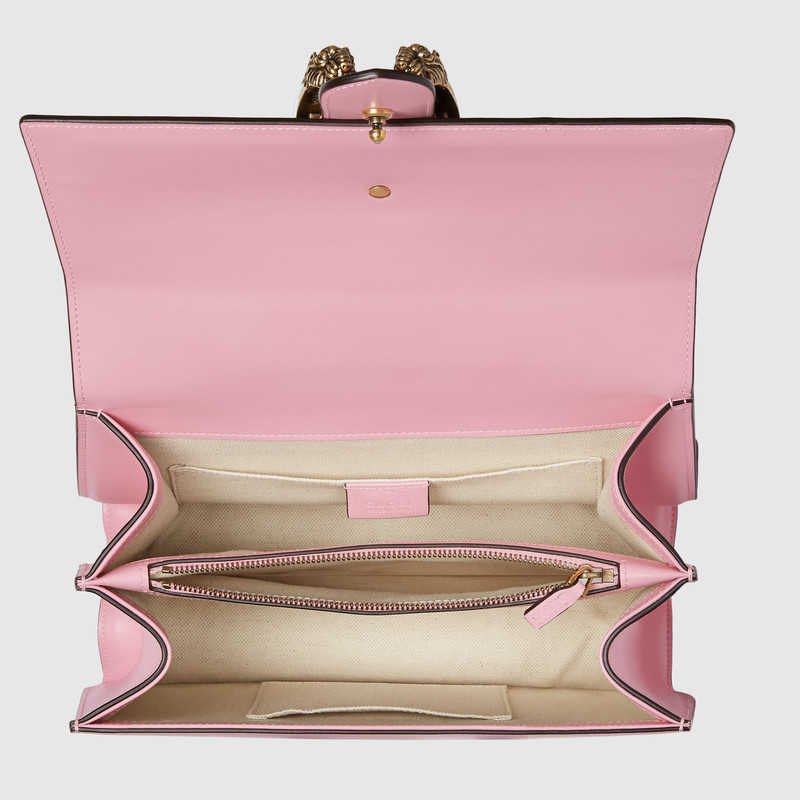 A structured contrast Dionysus bag in leather with the textured tiger head spur closure-a unique detail referencing the Greek god Dionysus, who in myth is said to have crossed the river Tigris on a tiger sent to him by Zeus. Made in fine grain leather, noted for its shine and softness.
