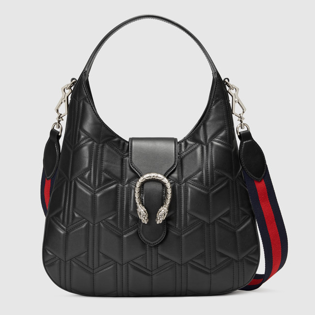 The Dionysus hobo is a new shape this season complete with the tiger heard closure-a unique detail referencing the Greek god Dionysus, who in myth is said to have crossed the river Tigris on a tiger sent to him by Zeus. Made in matelasse leather with a cubic pattern.