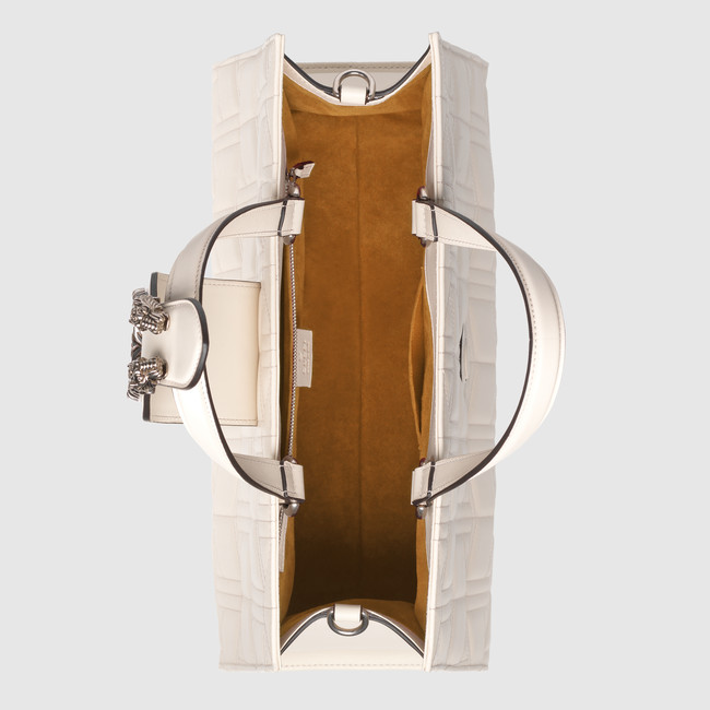 A new top handle bag in the Dionysus collection with the tiger heard closure-a unique detail referencing the Greek god Dionysus, who in myth is said to have crossed the river Tigris on a tiger sent to him by Zeus. Made in matelasse leather with a cubic pattern.